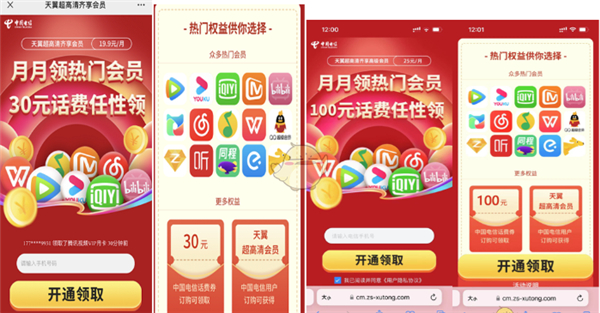 2、在活动期间,用户可以通过抖音、腾讯等互联网APP活动广告进入活动页面,订购19.9元/月的天翼超高清齐享会员,即可选择每月15款热门会员权益中的一个,还可获得30元的电信话费券。或者订购25元/月的天翼超高清齐享高级会员,可以选择每月15款热门会员权益中的一个。